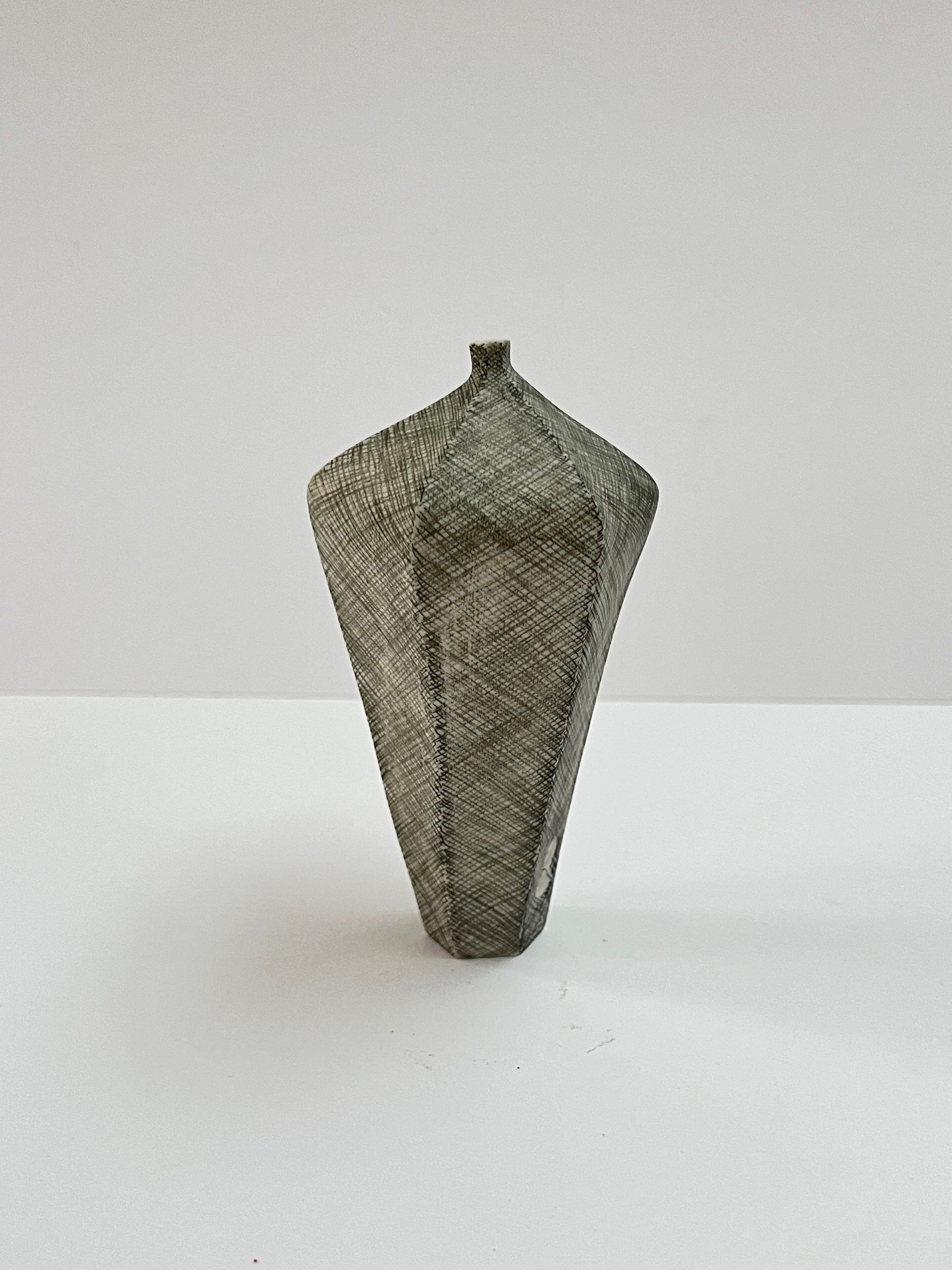 Hand built porcelain vessel decorated with hand drawn marks using underglaze pencil.