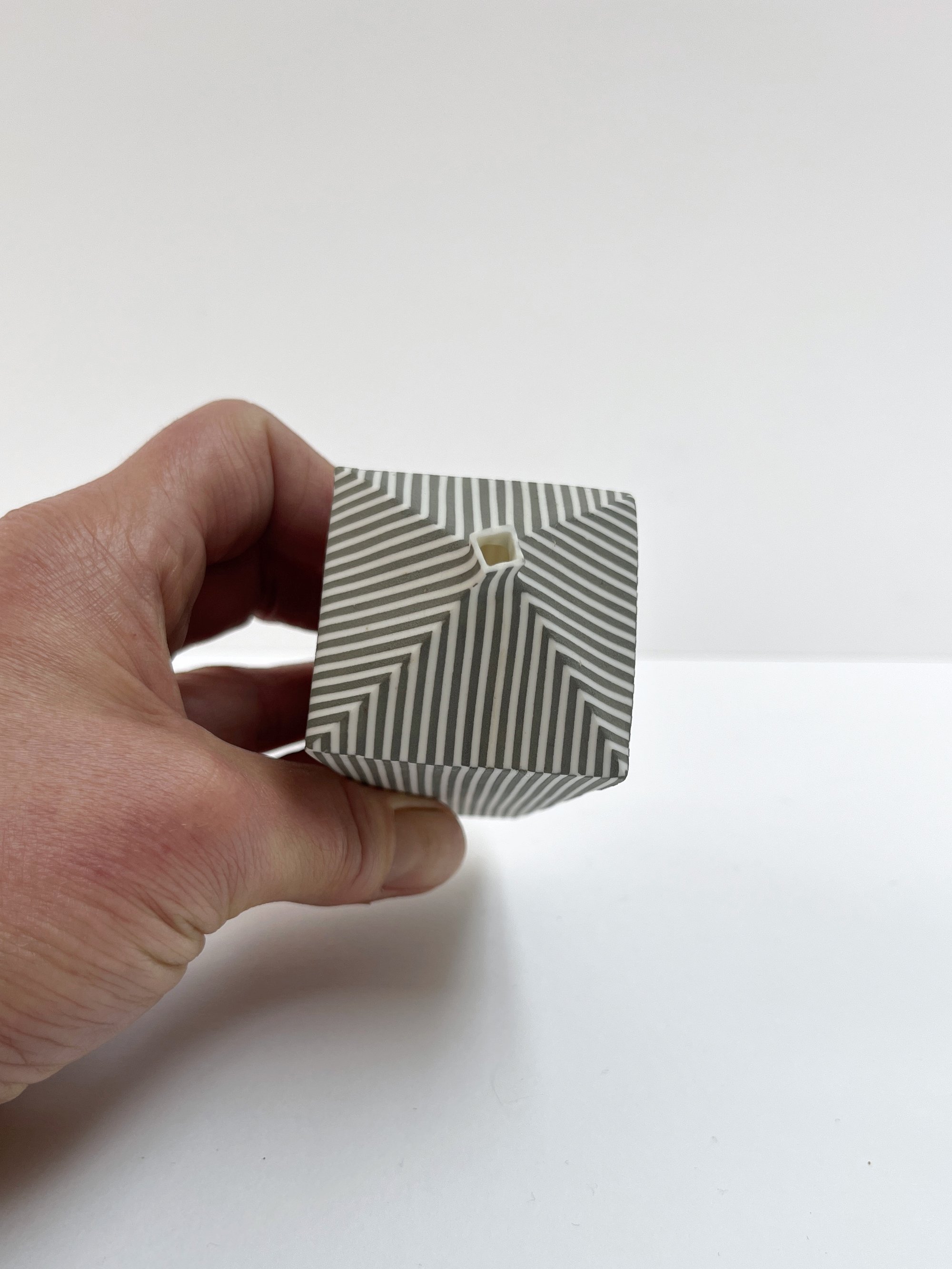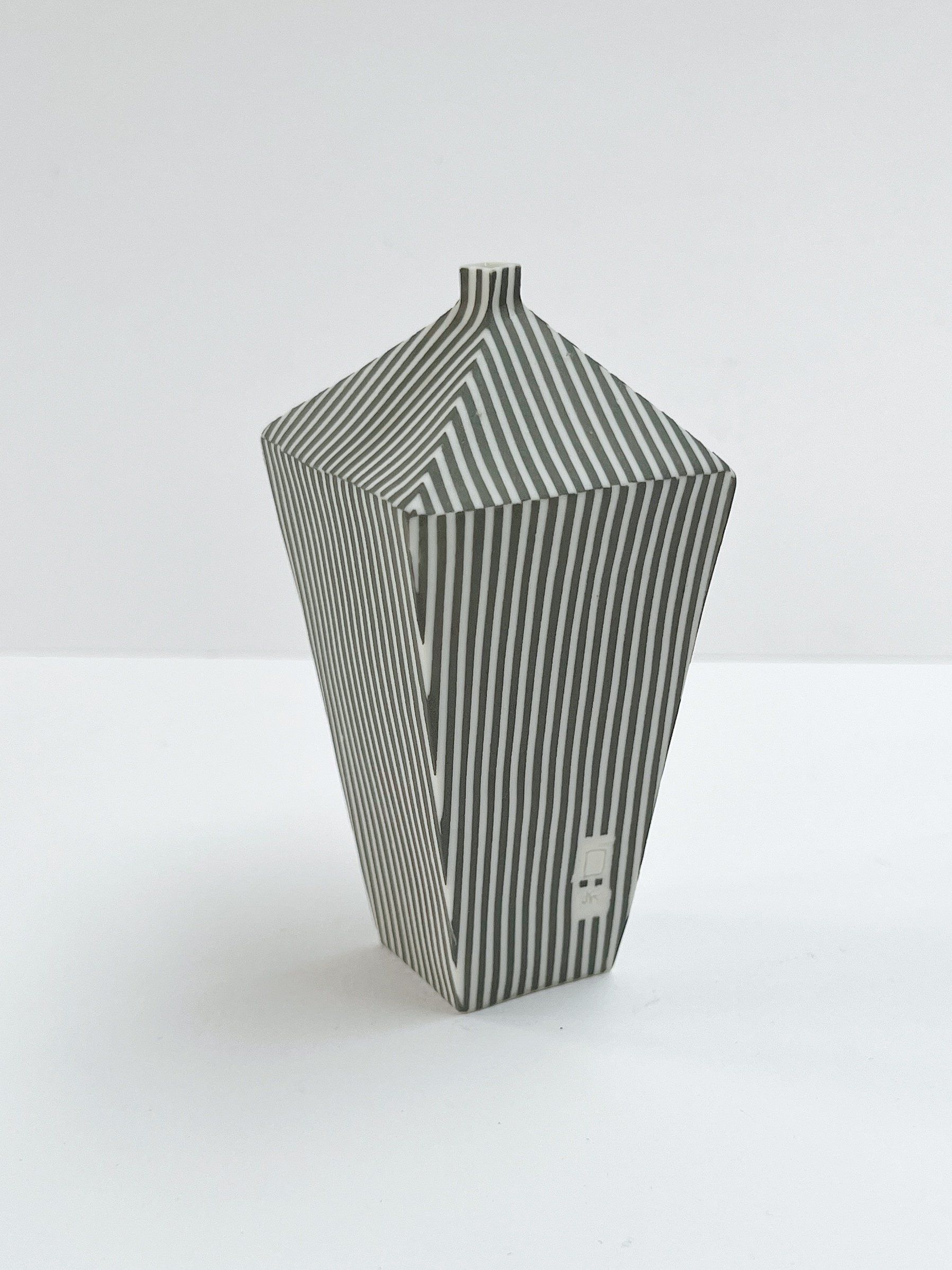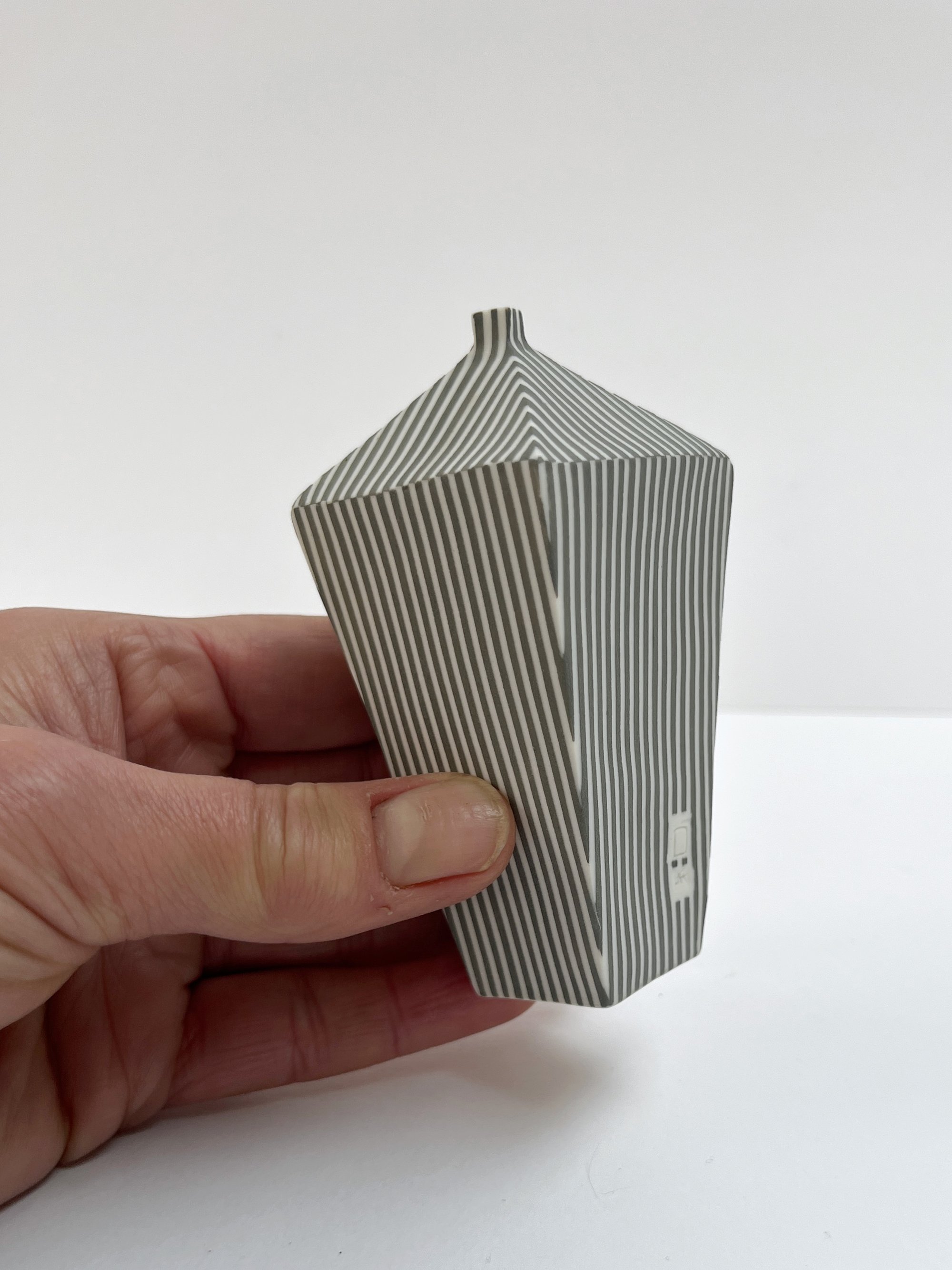 Each vessel is individually made in my studio in West Wales using porcelain, underglaze and transparent glaze. They are built using thinly rolled out slabs and constructed to form the tapered shape.