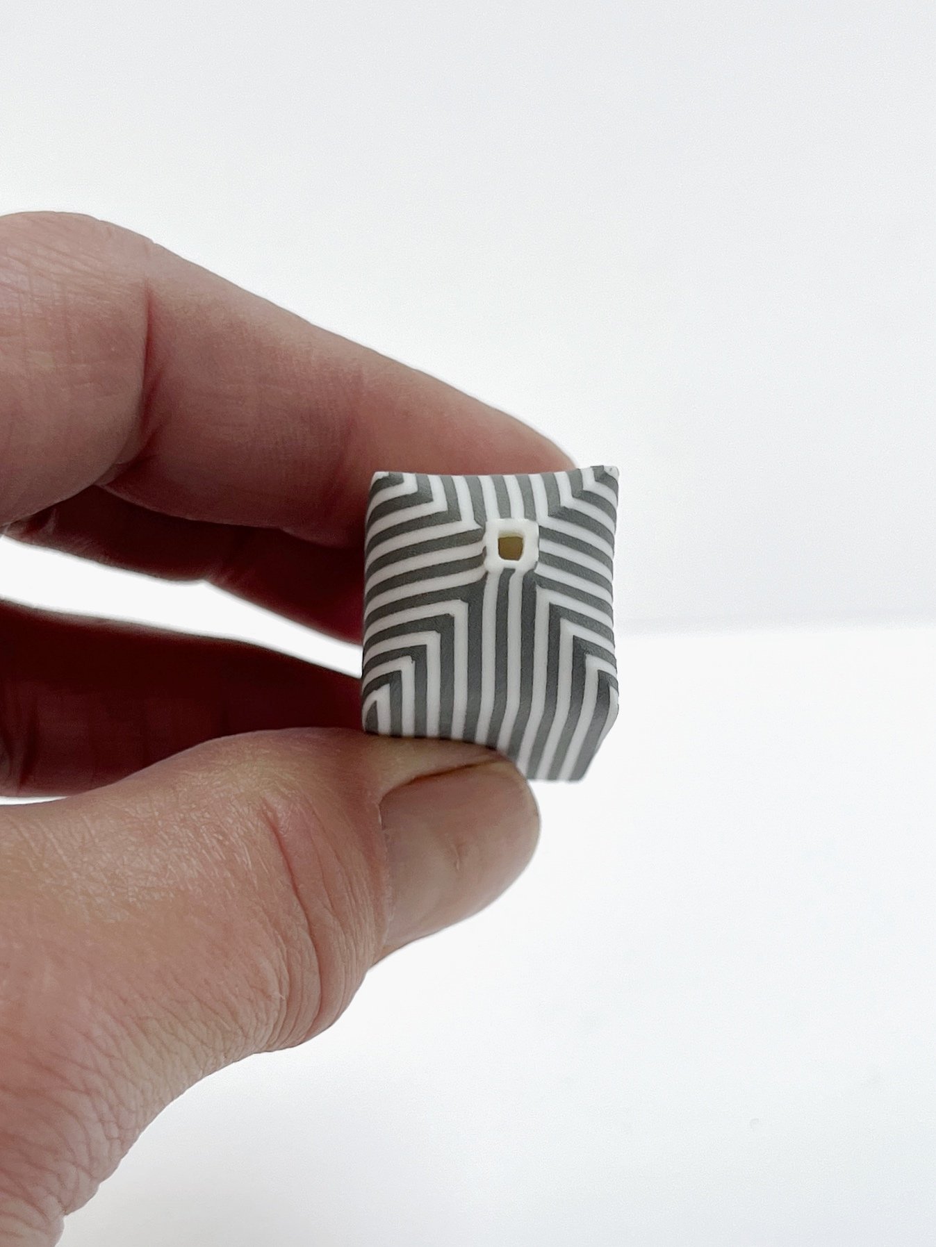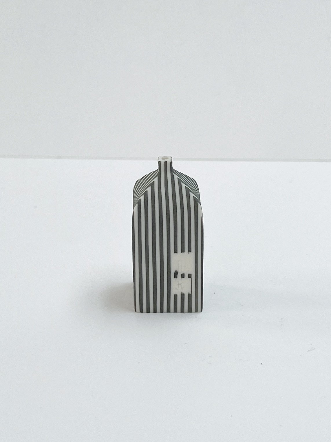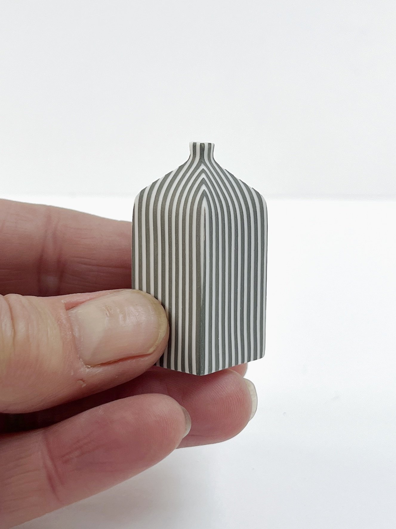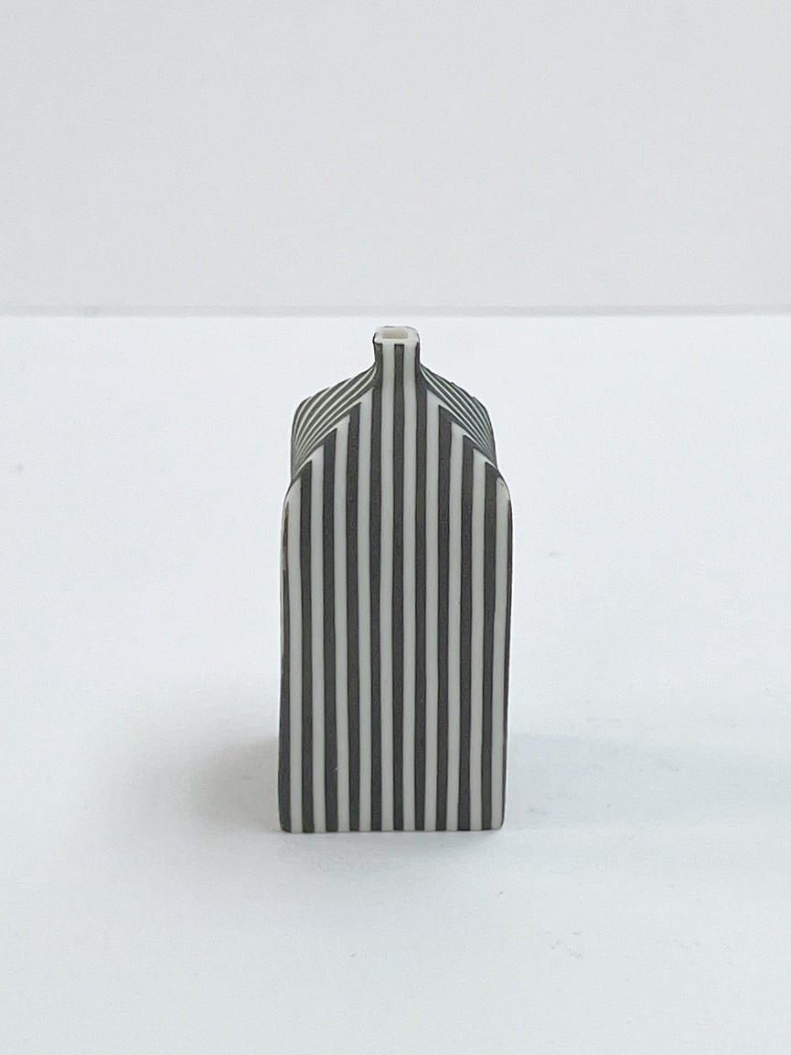Hand built porcelain vessel decorated with stripes.