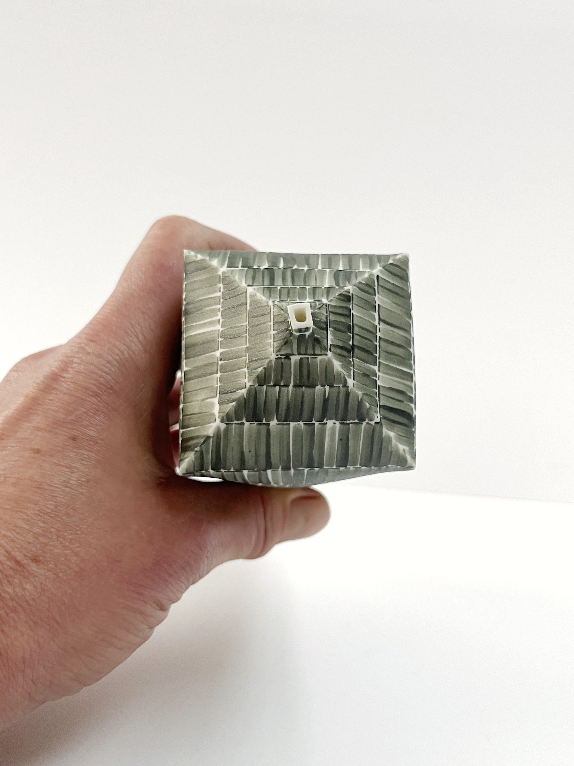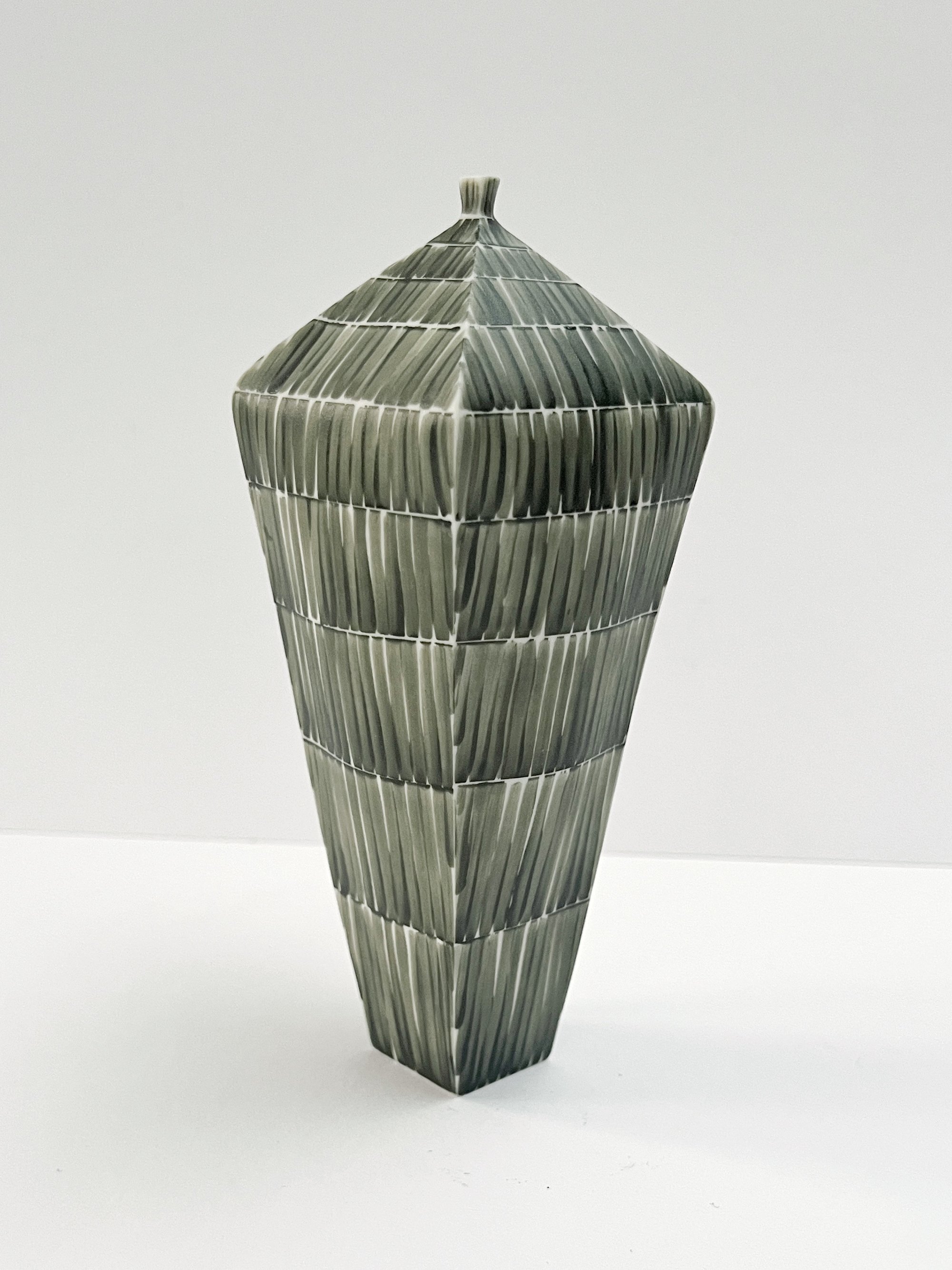 Hand built porcelain vessel decorated with underglaze brush strokes. This piece has a slightly rounded finish rather than a completely flat surface, almost as if ever so slightly inflated.
