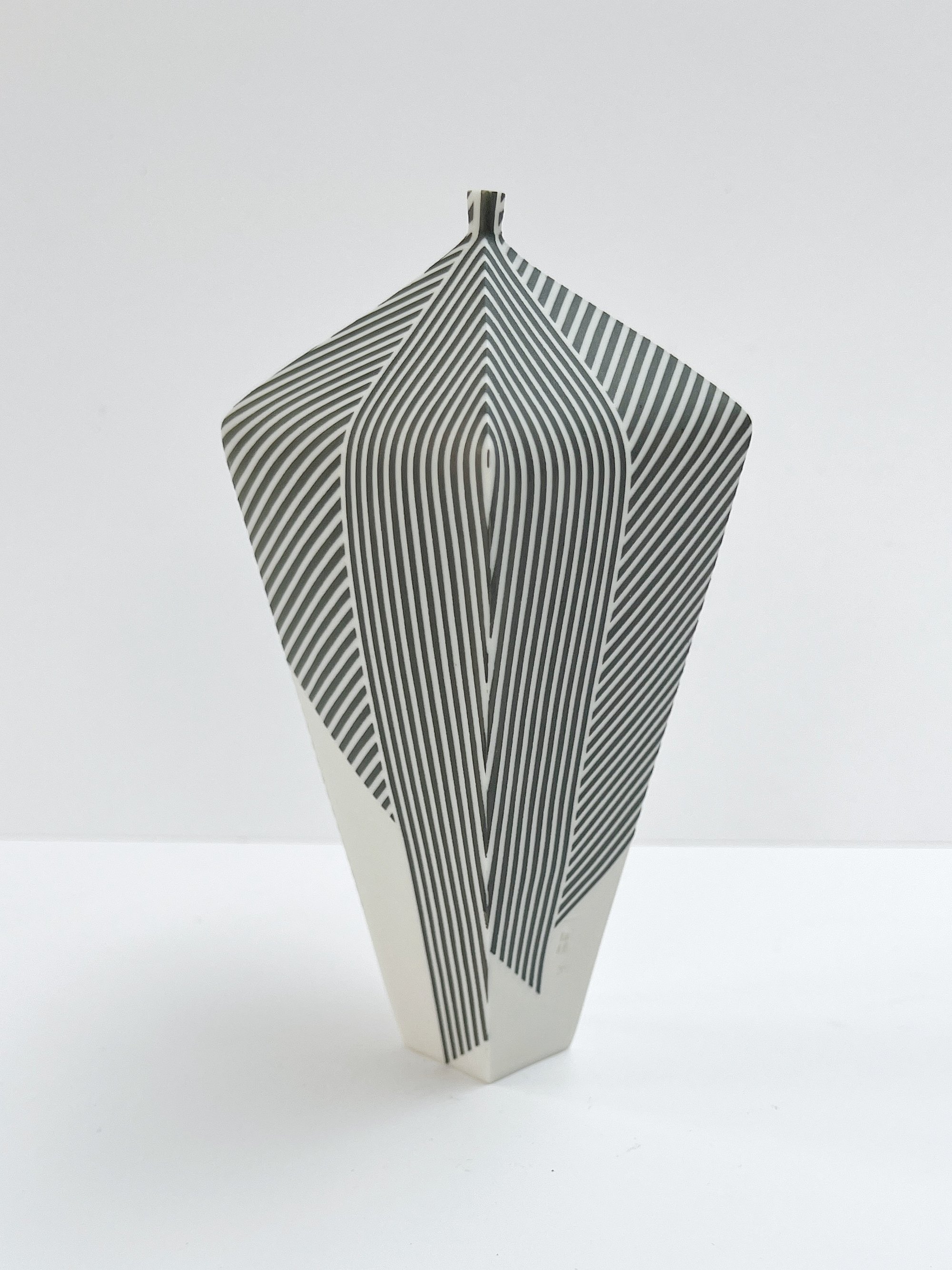 Hand built porcelain vessel decorated with stripes.