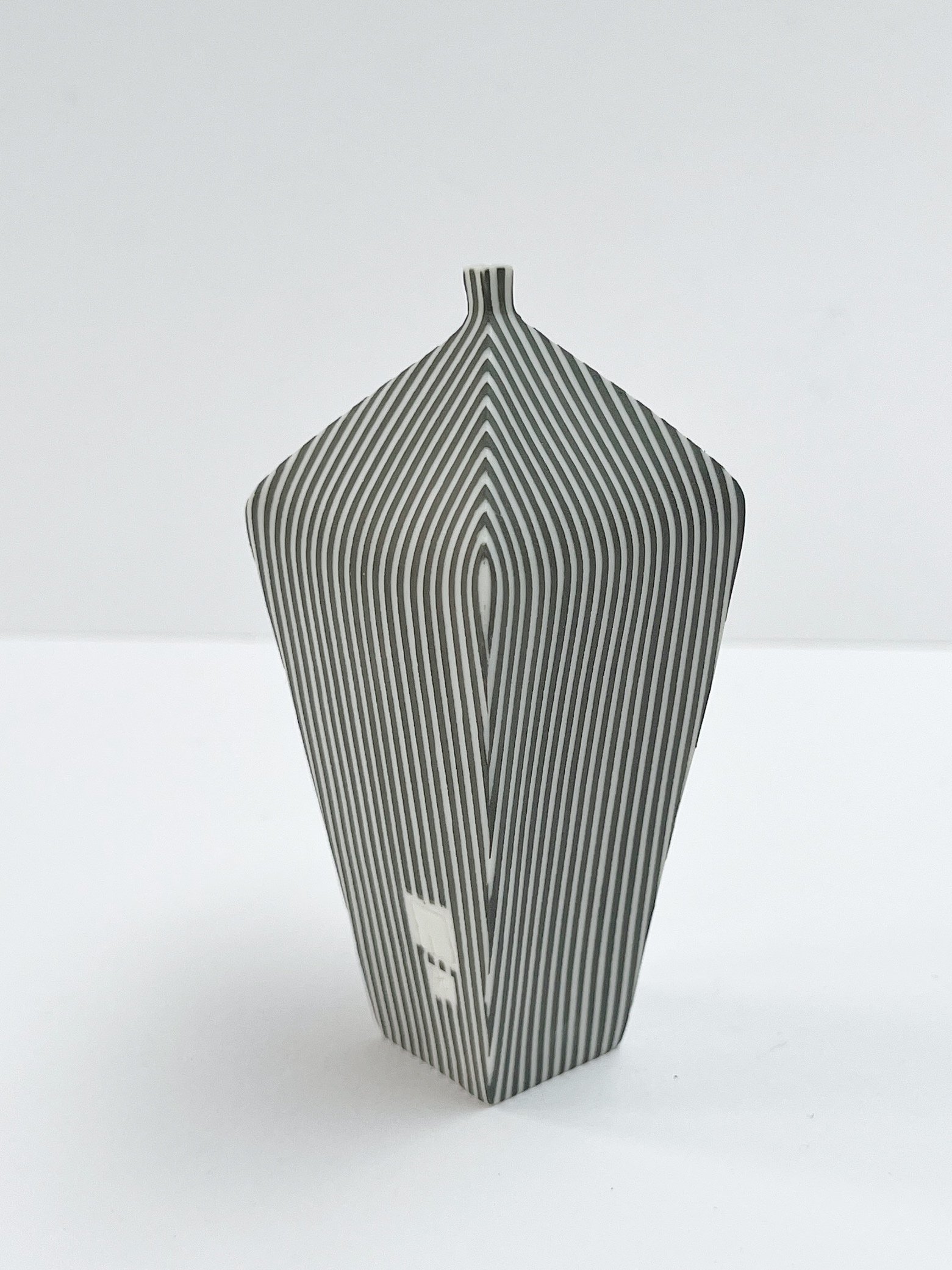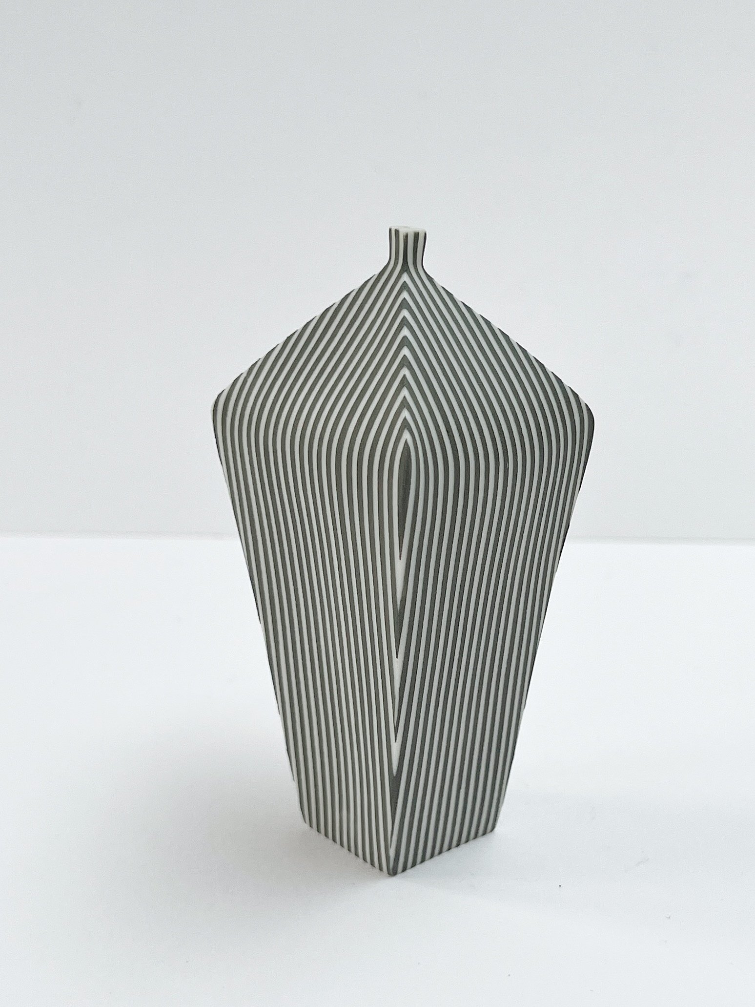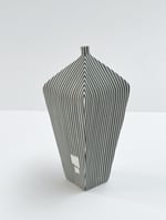 Hand built porcelain vessel decorated with stripes.