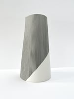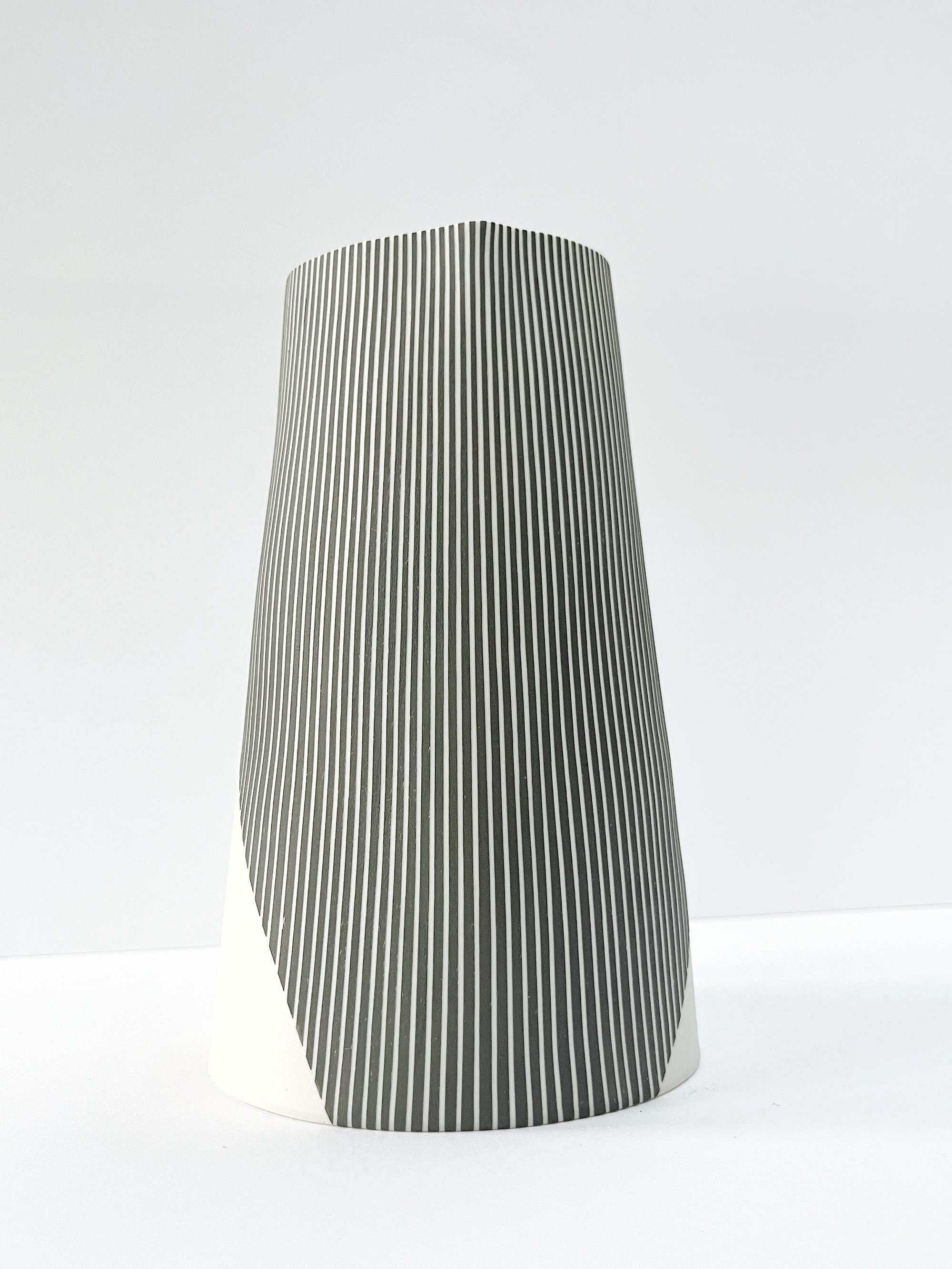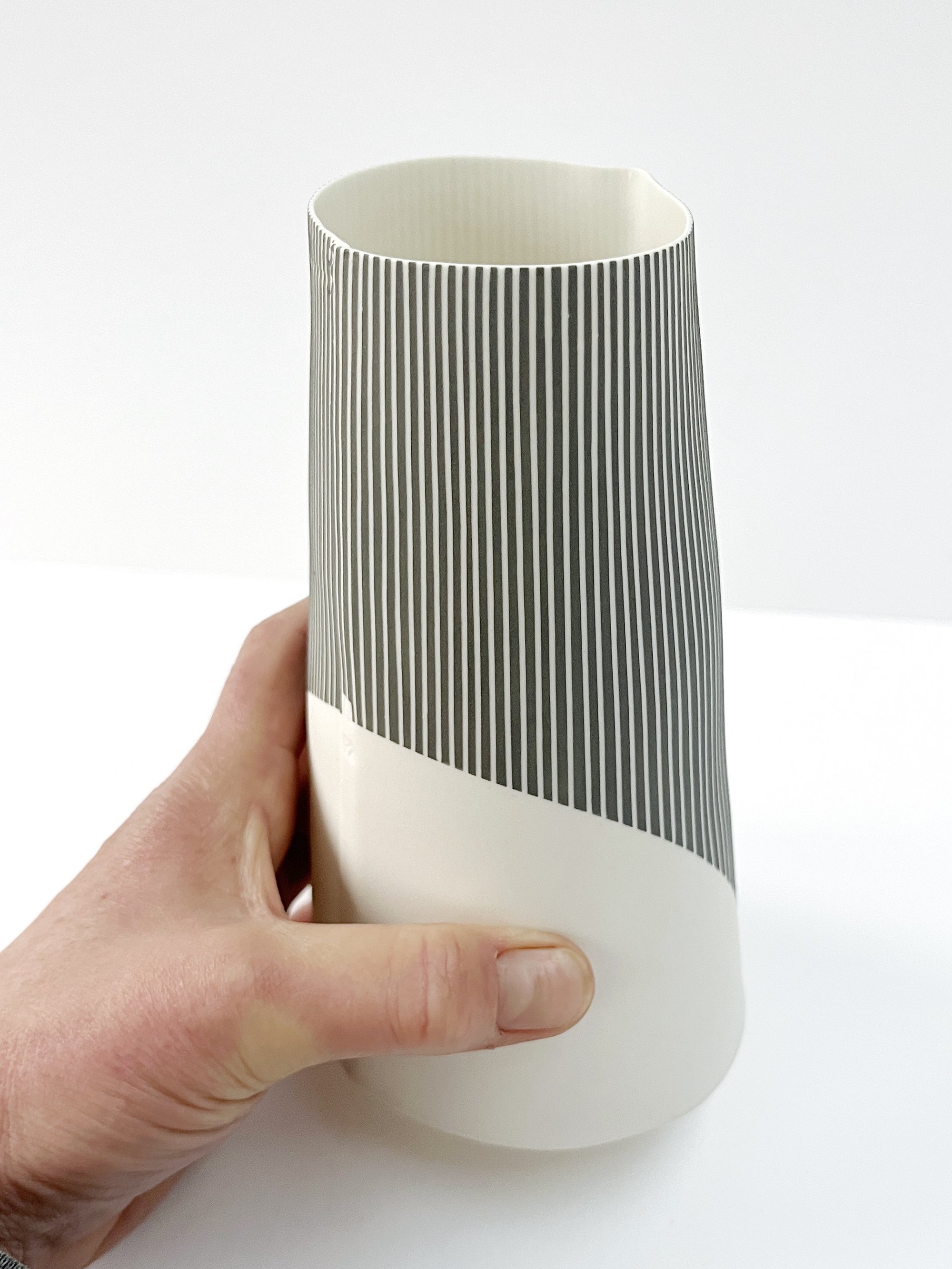 Each vessel is individually made in my studio in West Wales using porcelain, underglaze and transparent glaze. They are built using thinly rolled out slabs and constructed to form the tapered shape.