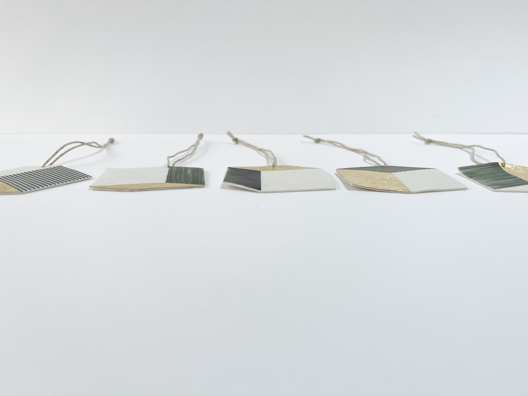 Hand built porcelain decorations with gold leaf. Please choose from the drop down menu.