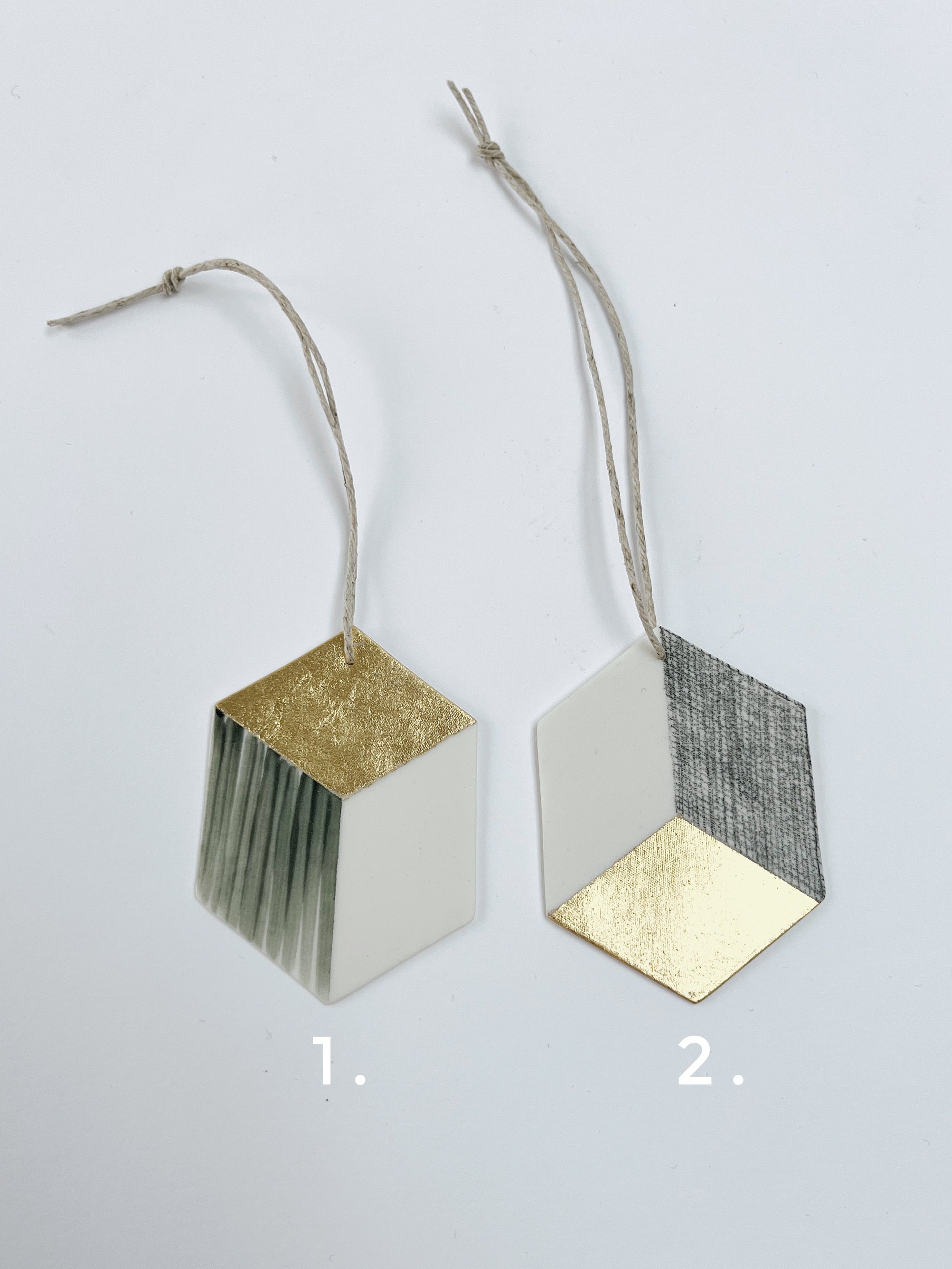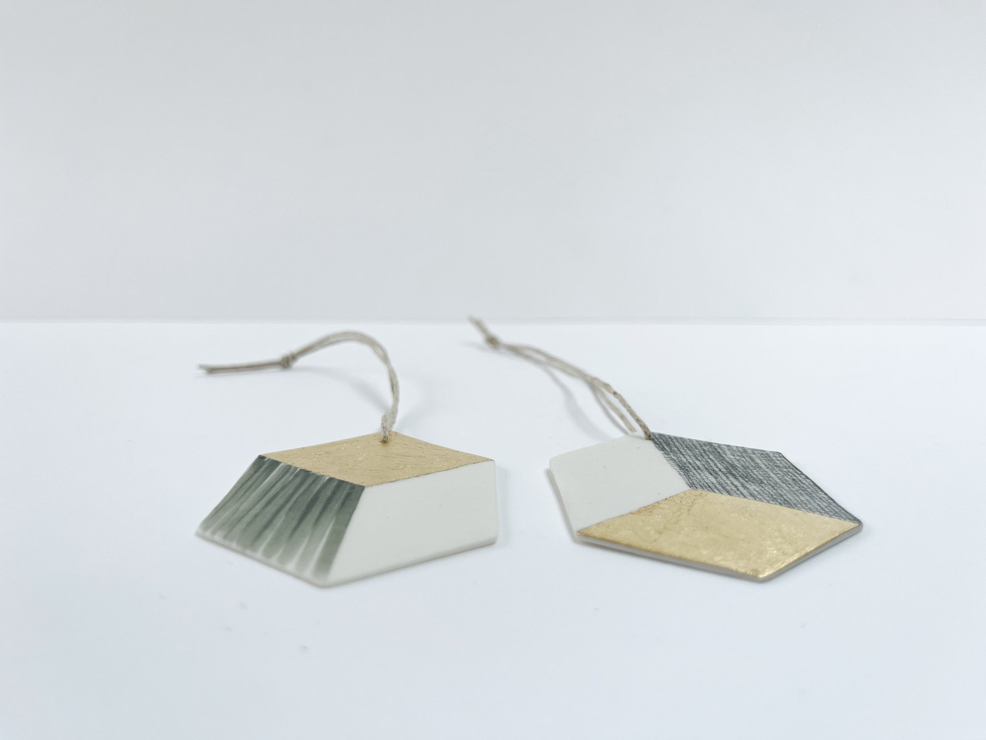 Hand built porcelain decorations with gold leaf. Please choose from the drop down menu.