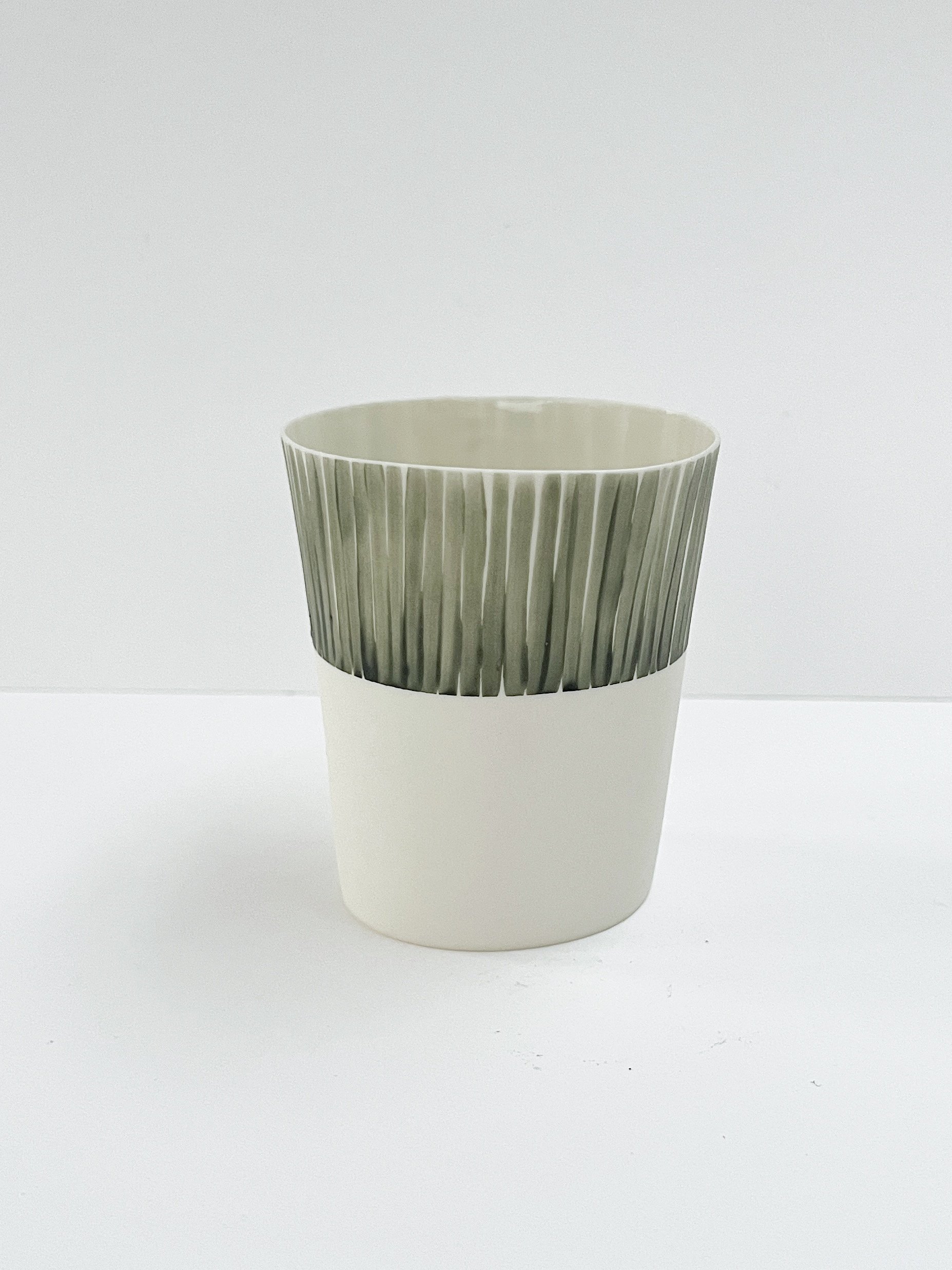 Hand built porcelain vessel decorated with brush strokes using underglaze.