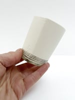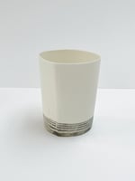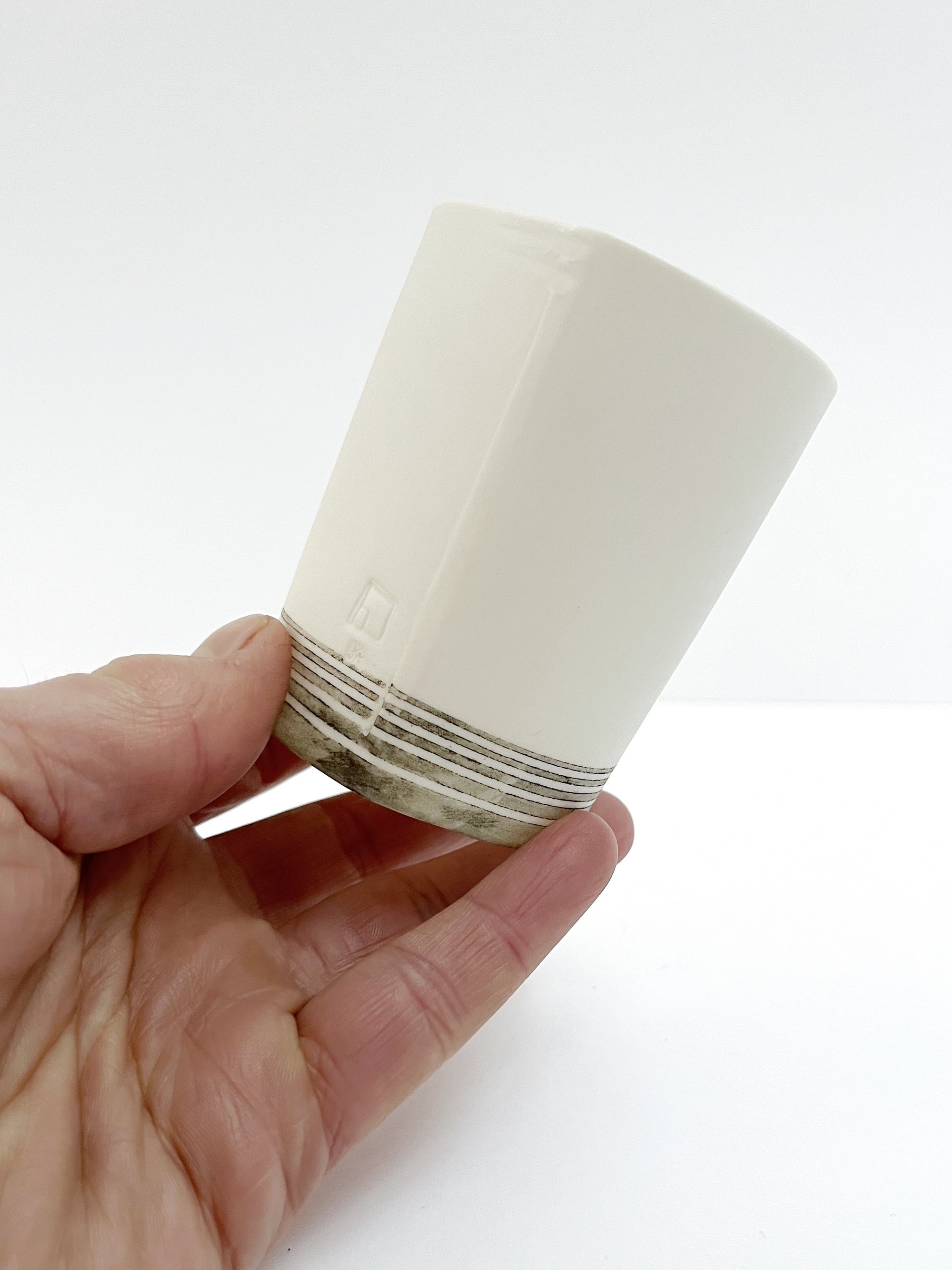 Hand built porcelain vessel decorated with stripes using underglaze pencil dust.
